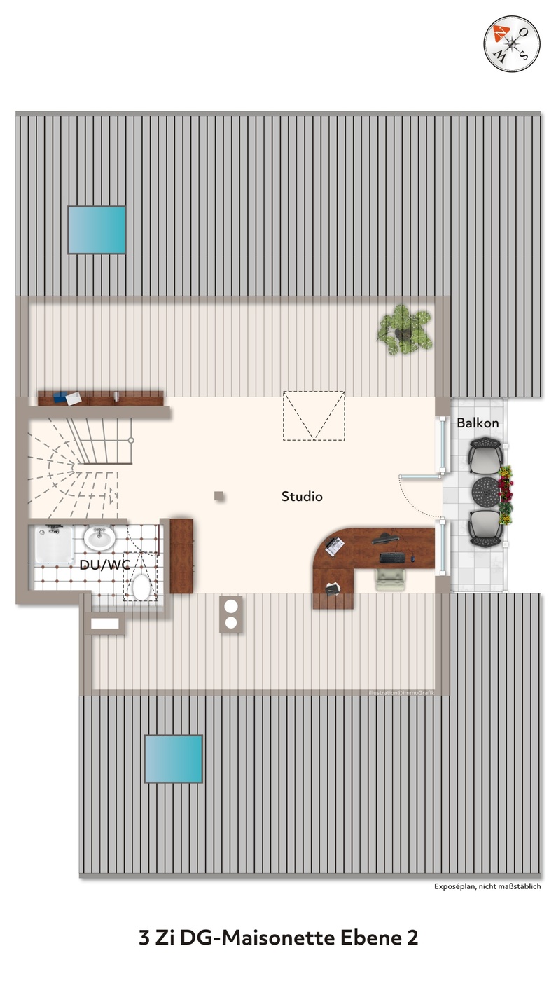 Über eine Holzwendeltreppe kommen Sie auf die zweite Ebene der Wohnung. Dieser Bereich unterteilt sich in ein Arbeits- oder Gästezimmer mit Zugang zu einem weiteren Balkon und ein Tageslichtbad mit Dusche.