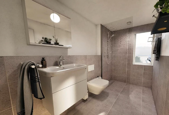Die Wohnung ist ausgestattet mit hochwertigen Bodenbelägen (Vinyl, Fliesen), Fußbodenheizung sowie einem Tageslichtbad mit Walk-in-Dusche.